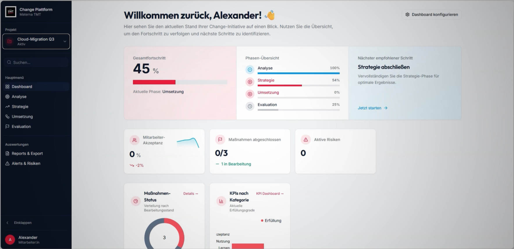 Die Plattform richtet sich an Projektleitende, Führungskräfte, interne Change Manager, Transformationsverantwortliche sowie C-Level-Entscheider:innen. Je nach Rolle stellt sie individuelle Sichten bereit, von detaillierten Arbeitsbereichen für operative Steuerung bis zu aggregierten Management-Übersichten mit klaren Entscheidungsgrundlagen.